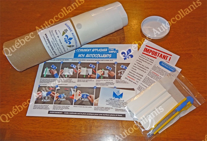 Voici ce qui est compris avec votre commande, une feuille: comment appliquer l'autocollant, un avis important, d'autres instruction, un ensemble pour appliquer l'autocollant (si vous avez achetez l'ensemble pour la pose) et une carte d'affaire de notre entreprise.