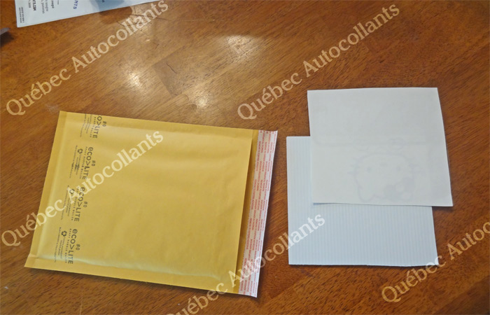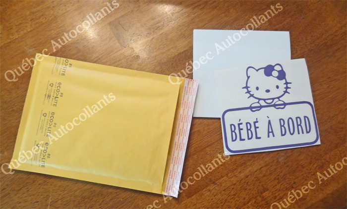 Nous emballons aussi soigneusement de plus petits autocollants, même aussi grands que 6 X 4 pouces dans une enveloppe à bulles scellée. Nous utilisons un raidisseur en carton ou un coroplast pour aider l'autocollant à rester à plat, pour ne pas qu'il se plie lors du transport.